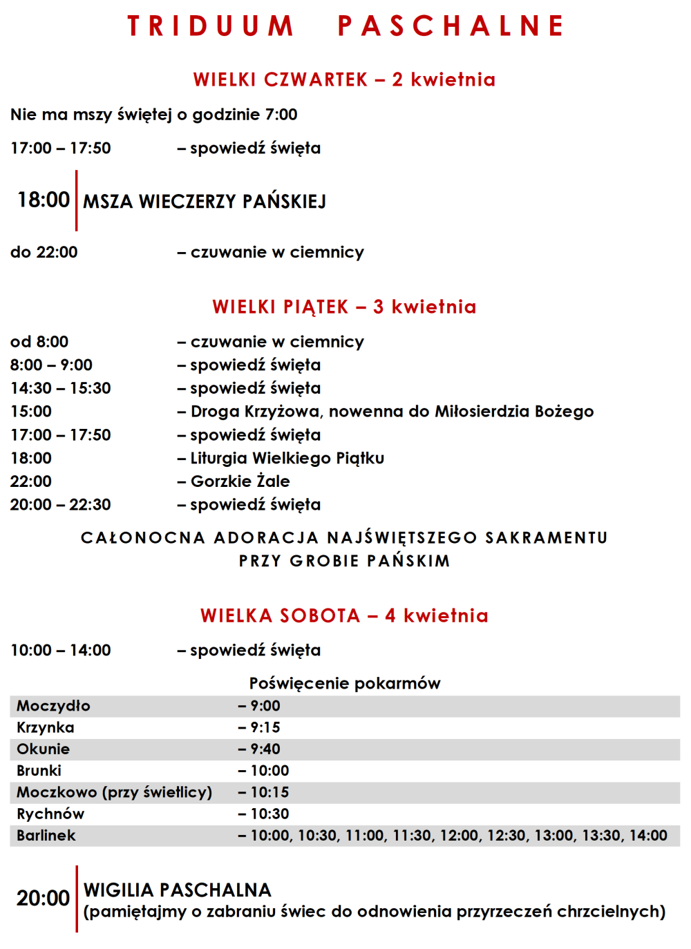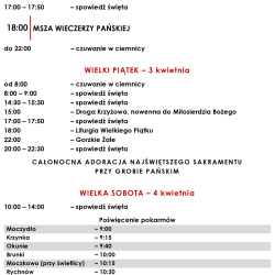 - Spowiedź święta: w niedzielę podczas każdej mszy świętej, w tygodniu od godziny 17:30.