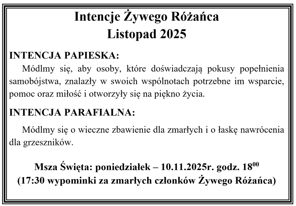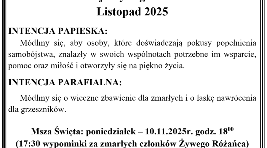 Msza Święta: poniedziałek – 10.11.2025r. godz. 1800