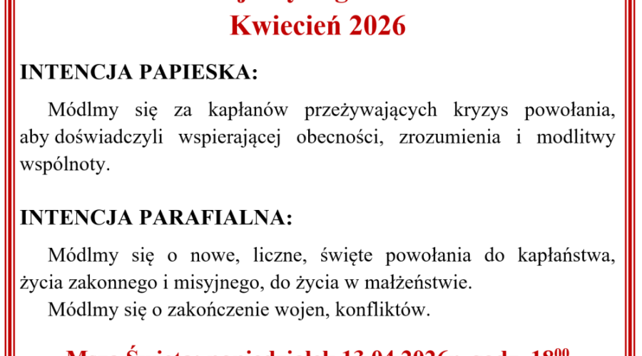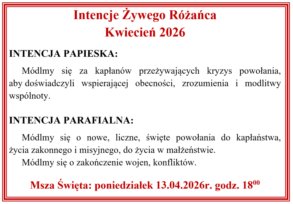 Msza Święta: poniedziałek 13.04.2026r. godz. 1800